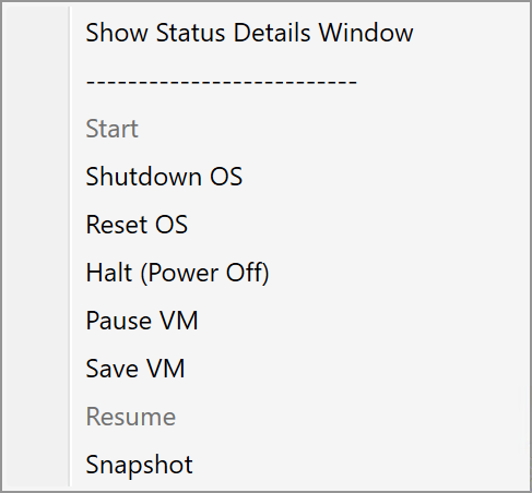 • Right Click menu added to start/stop/pause/snapshot the VM.