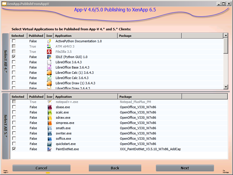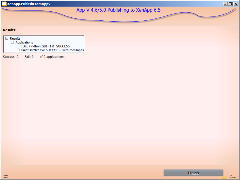 PublishFromAppV is a free GUI wizard tool to simplify the job of publishing virtual applications into the Citrix XenApp "AppCenter" console.